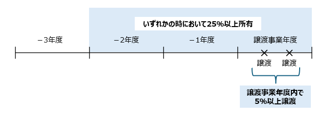 - 譲渡事業年度終了の日以前3年内のいずれかの時において、その外国法人を含む特殊関係株主等が内国法人の発行済株式等の25%以上を所有していたこと