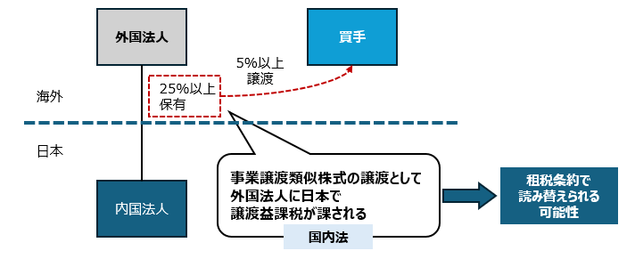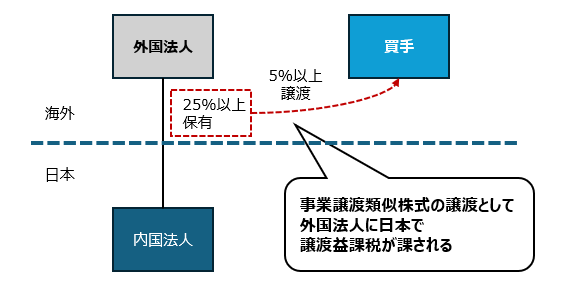 このように、外国法人が日本の株式を譲渡した場合、事業譲渡類似株式の譲渡に該当し、日本で課税が生じることもあるため、注意が必要です。