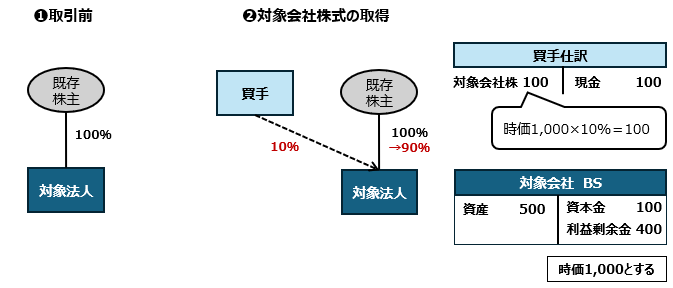 この場合、例えば、取得時の時価総額1,000とすると、取得価額は100(時価総額の10%相当)となる。