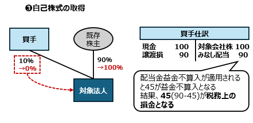 自己株式の取得は、税務上、譲渡損益の一部がみなし配当として計上されることになり、この部分が税務上のメリットとして、いくつかのシチュエーションにおいてストラクチャーステップのひとつとして検討されることが多いものとなっています。