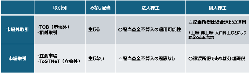 このように自己株式の取得は、ストラクチャーをはじめ、様々な場面で用いられることがありますが、取得する市場や状況などにより、みなし配当の論点が異なったり、取得するのが法人か個人かにおいても、課税関係が異なることがあるため、慎重に検討することが必要となります。