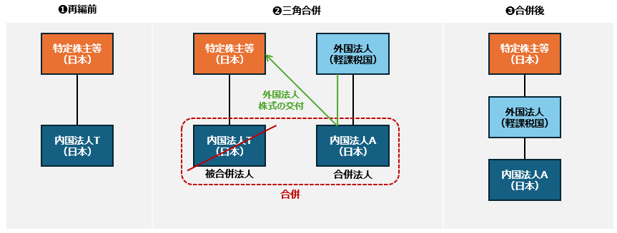 このような三角合併等により,内国法人の株主が軽課税国にある実体のない外国法人を通じて内国法人を所有する形態を作り出せば,外国子会社合算税制の適用を免れるなど,国際的な租税回避を行うことが容易になると考えられています。