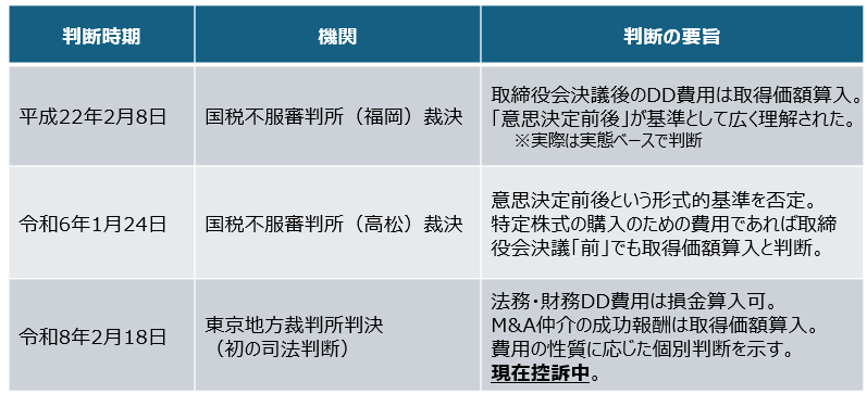 この裁決により、実務上は「取締役会等の意思決定前のDD費用=損金算入可能、意思決定後のDD費用=取得価額算入」という理解が広まりました。
