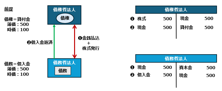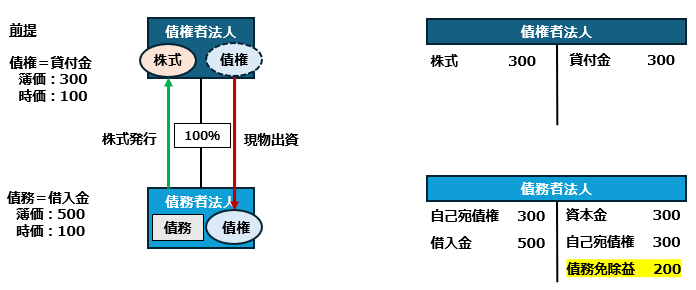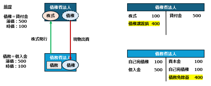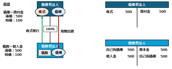 債権者の立場では、その保有する債権を債務者に現物出資して、債務者である法人の株式を取得することになります。