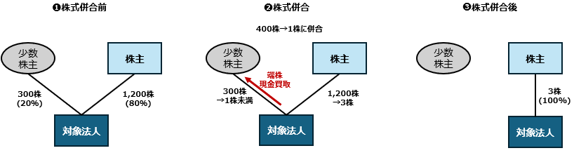 上記であれば、400株を1株にする株式併合を行った場合、少数株主が保有する株式は300株しかないため、株式併合により1株未満の端株となり、これを現金で買い取ることでスクイーズアウトすることができます。