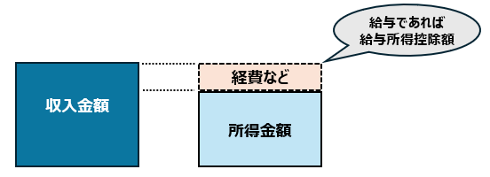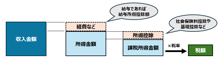 収入金額から一定の経費や所得控除などを引いて算出した課税所得金額に税率を乗じて計算する、といったイメージです。