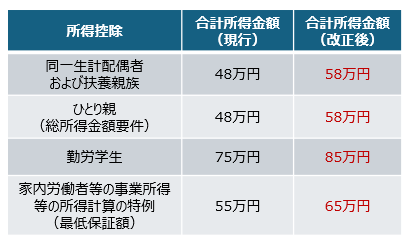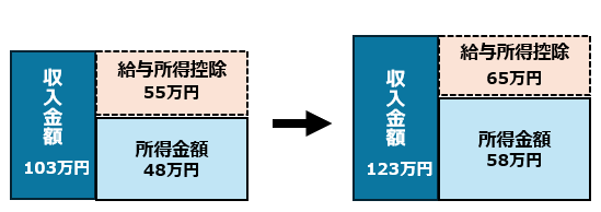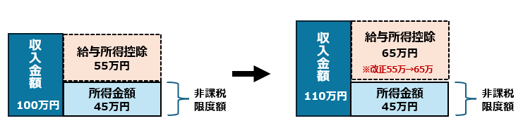 この給与所得控除の最低保障額が改正前は55万円だったところ、65万円に改正されました。