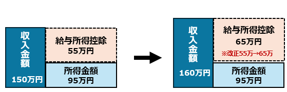 こちらも給与所得控除の改正により、年収150万円が160万円になっています。