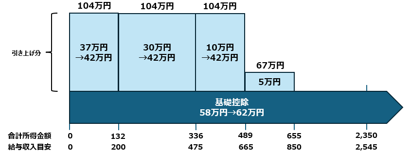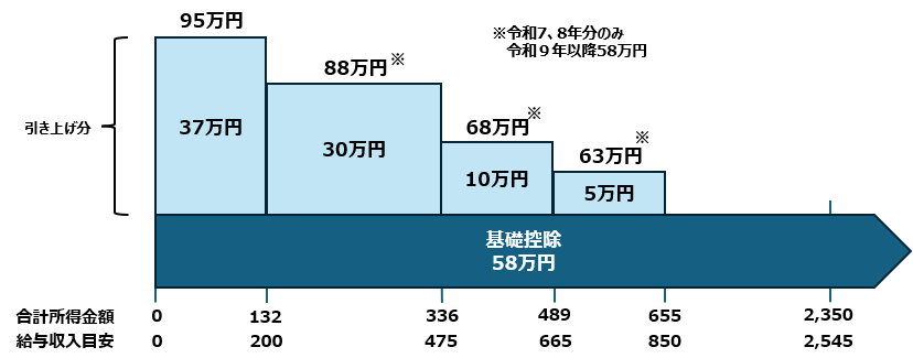 令和7年改正では基礎控除は次のように改正され、年収に応じて段階的なものになっていました。