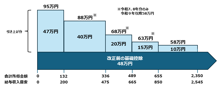 また、基礎控除も25年の改正で次のように年収によって控除額が異なっています。