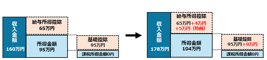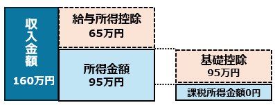 つまり、給与所得控除の最低保障額が65万円、基礎控除95万円を足した160万円までは所得税がかからないため、160万円が年収の壁になっています。