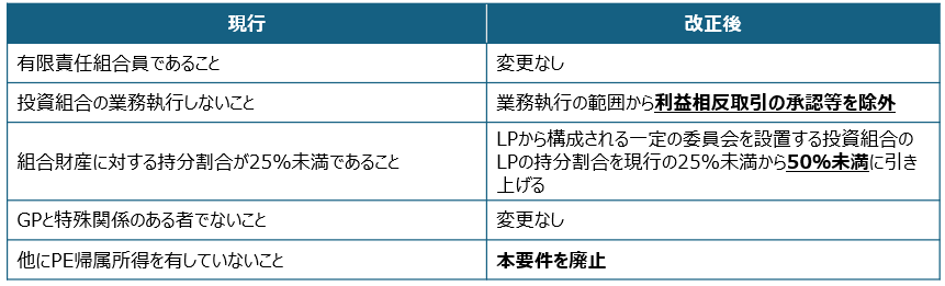 本規定を適用する場合には、一定の要件を充足する必要があるが、この要件の一部について、国内への投資の障壁となっているとの指摘があることから、ファンドに対する持分割合の上限引き上げを含めた必要な見直しが行われる。